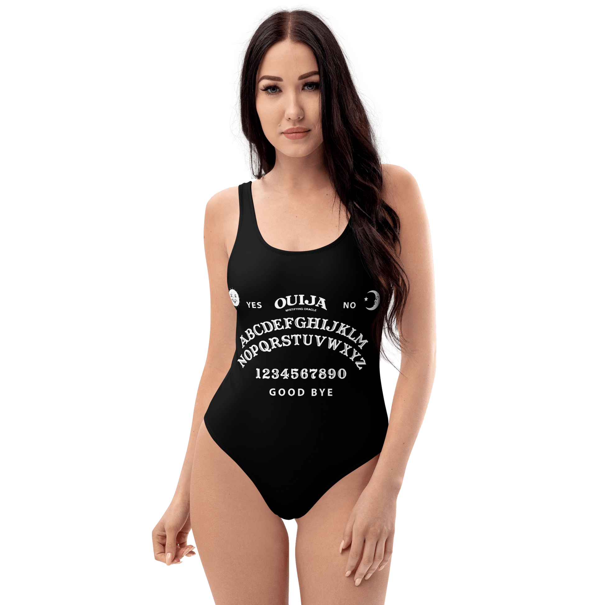 This one-piece ouija board goth swimsuit for all figures will bring out your best features. Enjoy the smooth fabric and the flattering design, and show it off by the sea or pool!