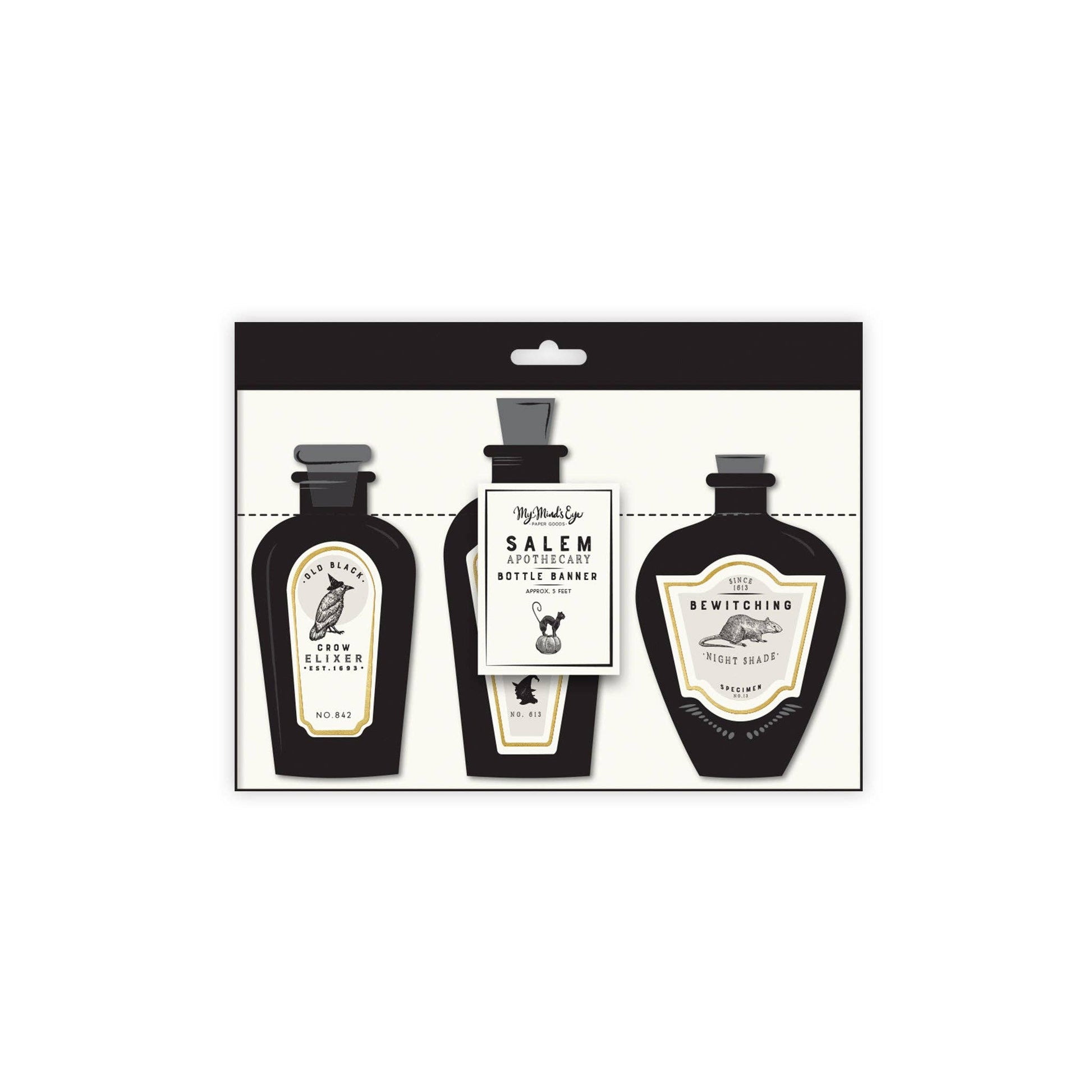 Become a potions master with this potion bottle banner! Featuring vintage inspired apothecary bottles, this stitched banner is brings a witchy vibe to your home this Halloween!