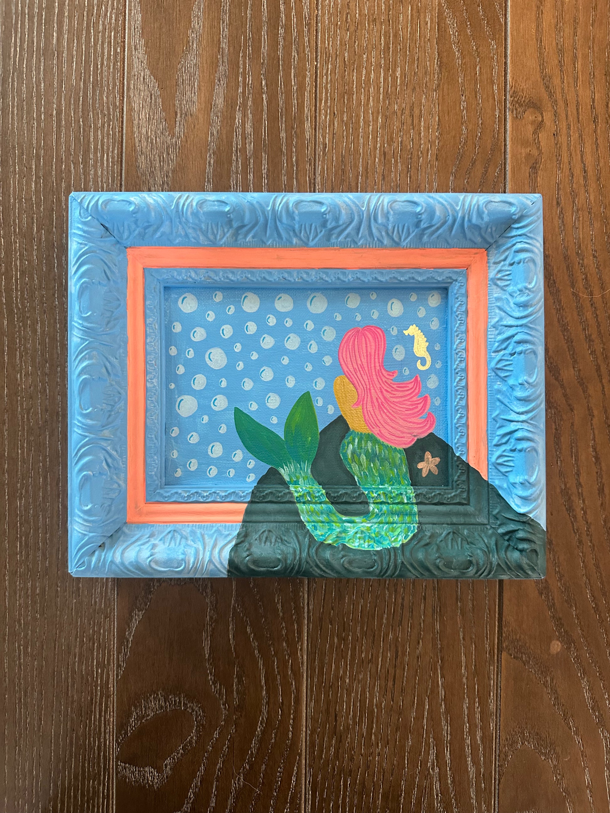 She perches on her rock throne, bubbles drifting past, pink hair flowing like coral. A small seahorse hovers, as if whispering the sea’s oldest secret. A painting for dreamers, ocean-lovers, and anyone who believes in a little mermaid magic.