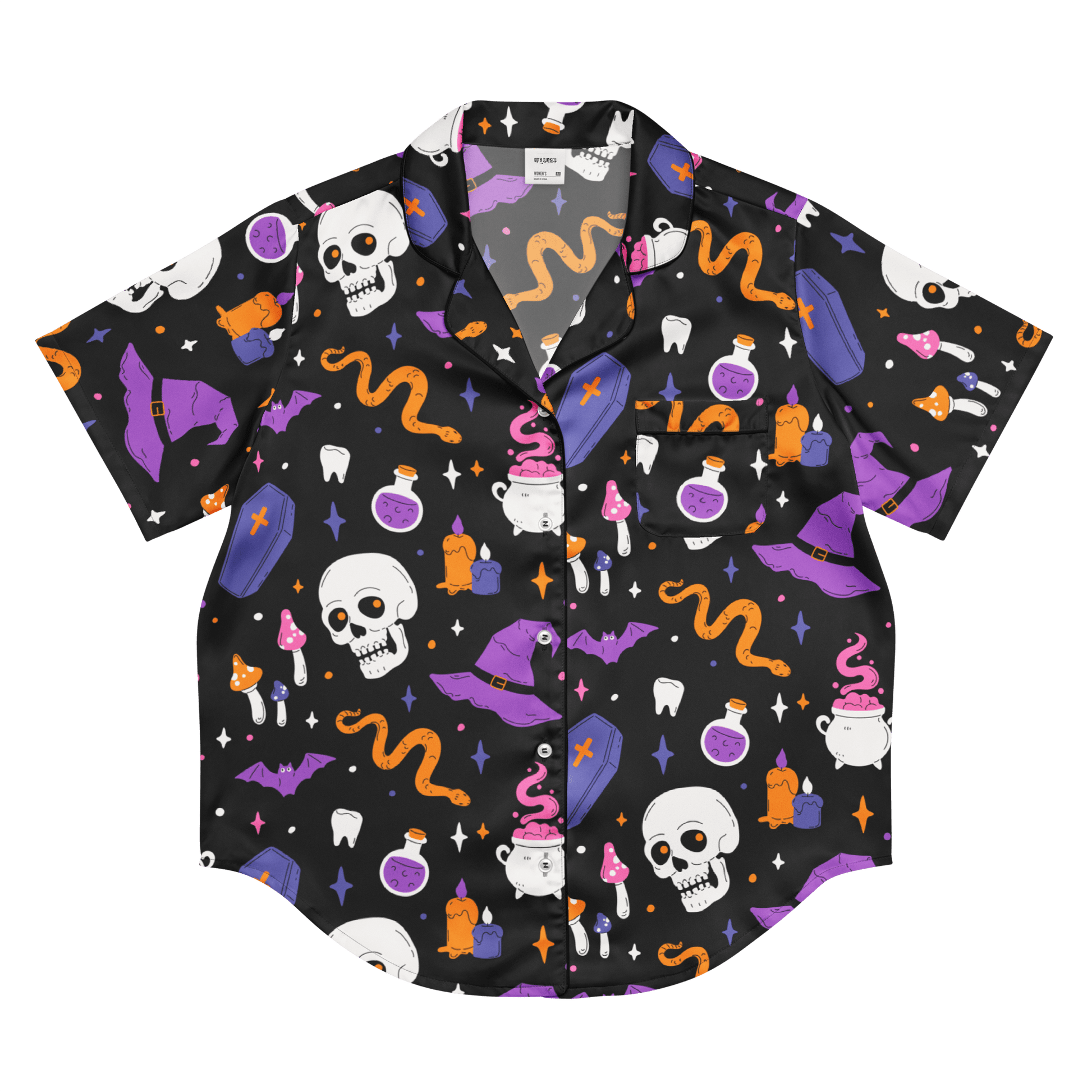 Indulge in luxury with our silky-feel pajama top in the Witch's Whimsy print, featuring a witchy all-over print of coffins, skulls, snakes, candles, and cauldrons.